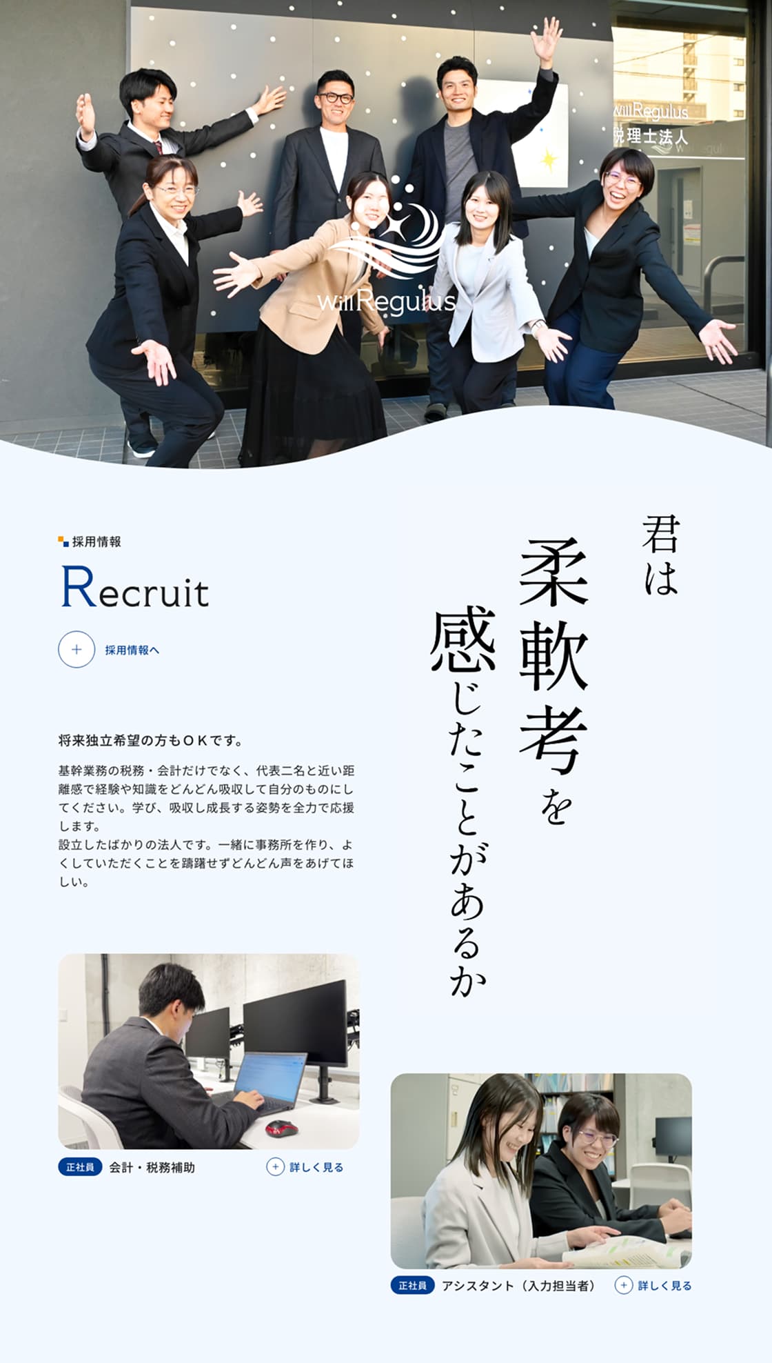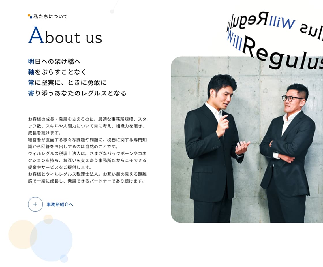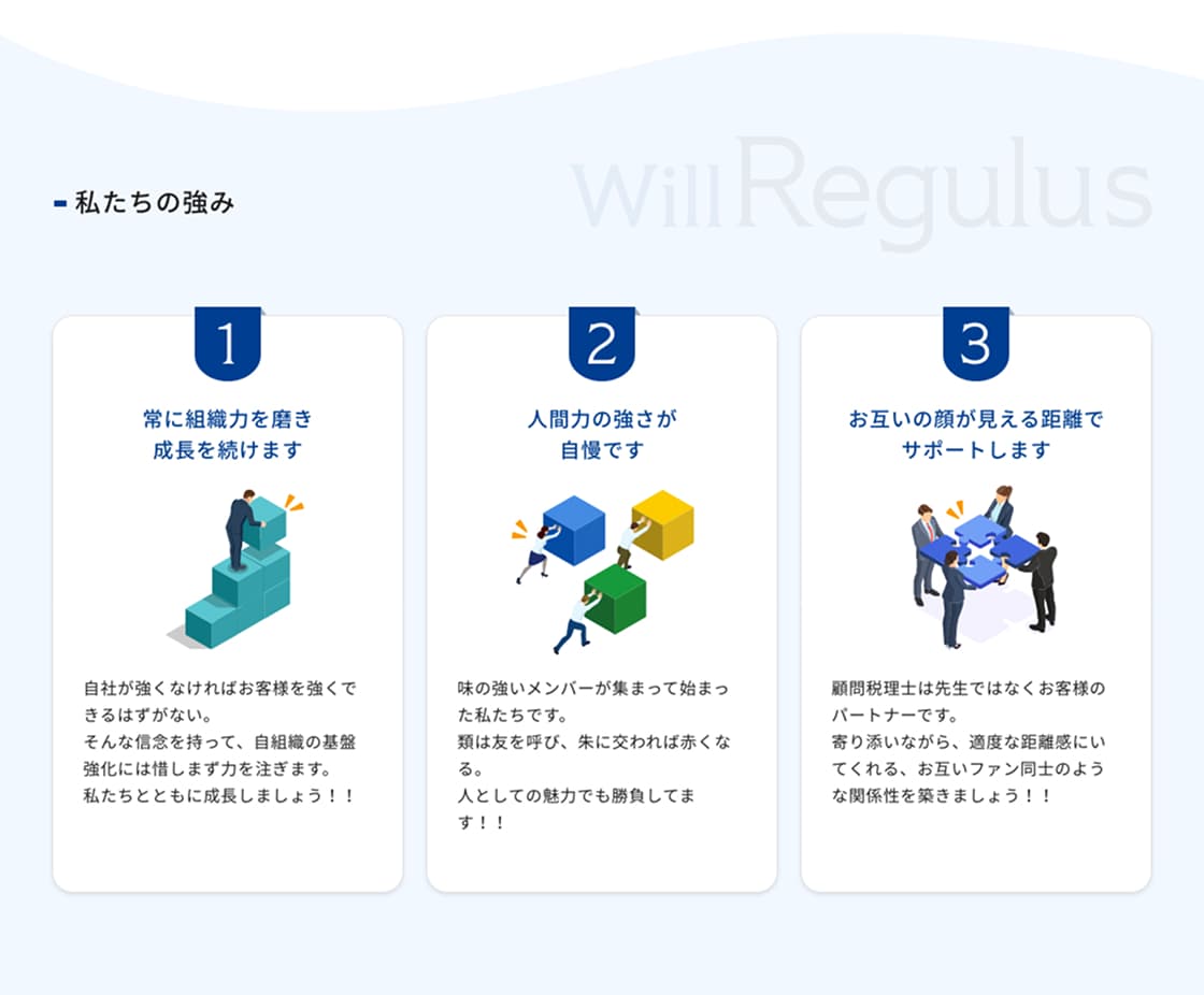 そして「ともに働く仲間の成長と幸せであり、誇りを持って働ける場所が、質の高い仕事を生む」という循環を原動力としているWillRegulus税理士法人様の「かっこよくて、やさしくて、骨太な人間力を土台に、数字では測れない手応えを社会に届ける」姿勢を伝えるための新規サイトの制作についてご紹介させていただきます。